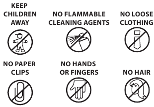 WARNING ICONS: The icons on top of the shredder warn the user of the potential dangers if the shredder is used improperly.