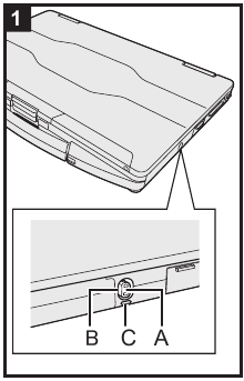 Use the tether to attach the stylus to the computer so you will not lose it. Before attaching the pen (A), take out it from the pen holder (B). There is a tether hole (C) to attach it.