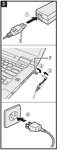 - Connect the power cord and AC adaptor. Hold the plug (E) of the power cord, and securely insert it straight to the end.