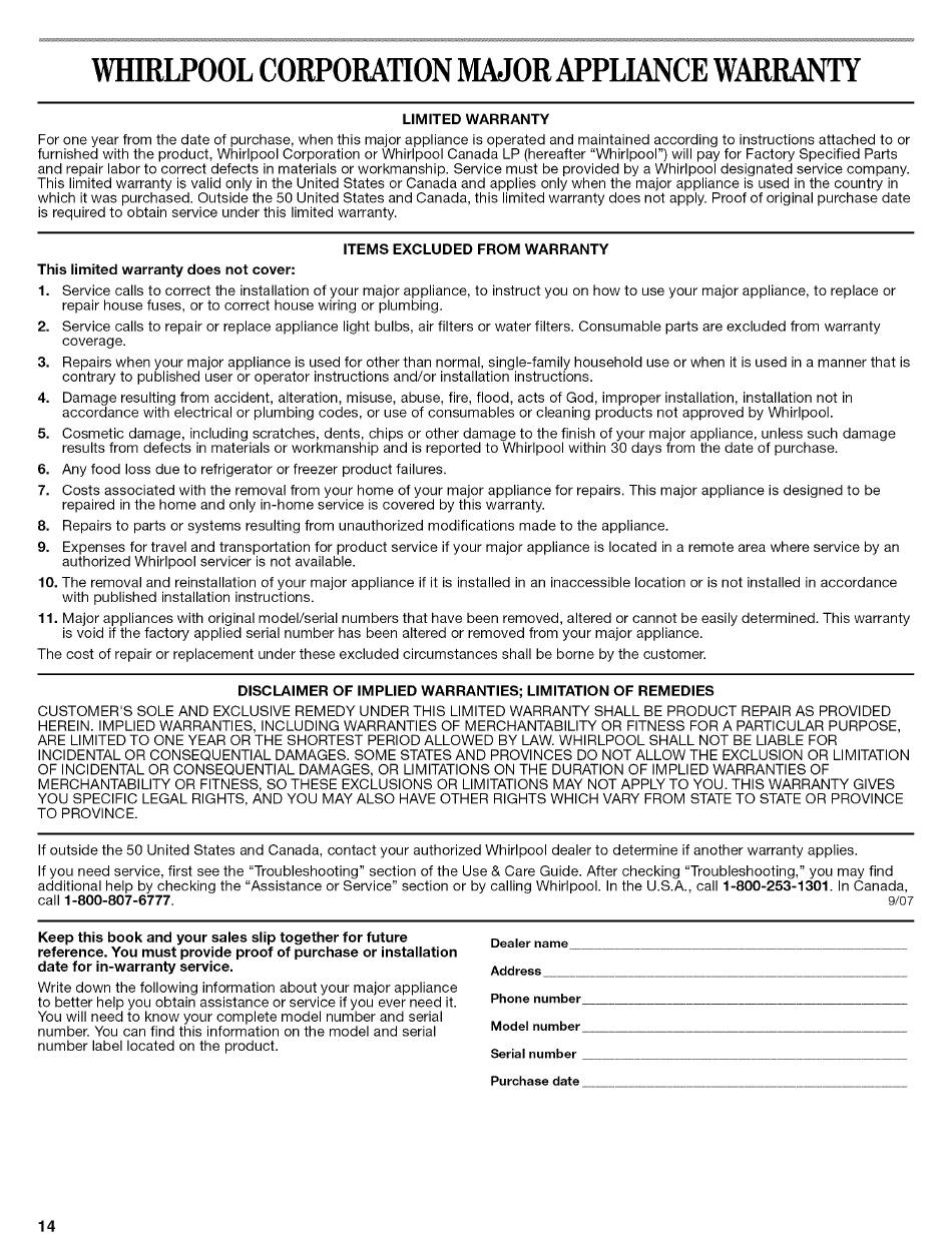 If outside the 50 United States and Canada, contact your authorized Whirlpool dealer to determine if another warranty applies.