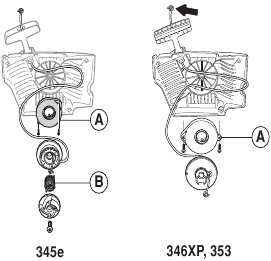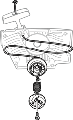 | Check that the components of the throttle control work safely. (Throttle lockout and throttle control.) | Check the starter, starter cord and return spring. | Check the clutch centre, clutch drum and clutch spring for wear. |