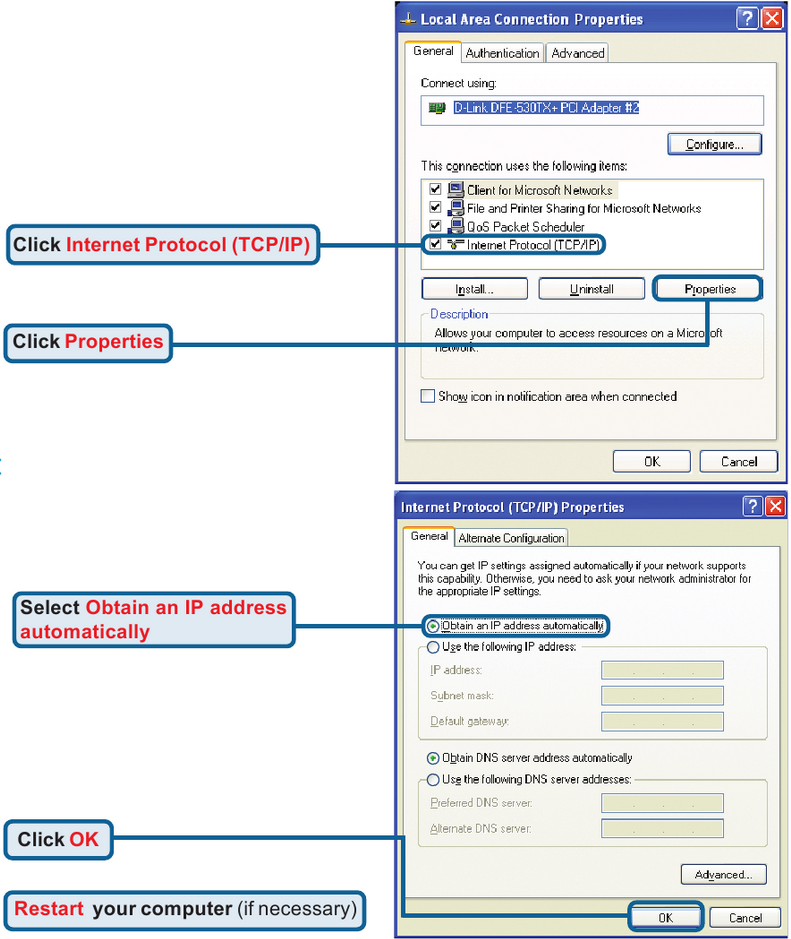 To connect to the network, make sure the network adapter in your computer is configured properly. Here's how to configure the network adapter to obtain an IP address automatically for the DI-524 Wireless Broadband Router.
