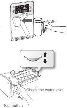Make sure the water storage tank inside the Refrigerator is properly filled. To do this, press the water dispenser lever until the water runs from the water outlet.