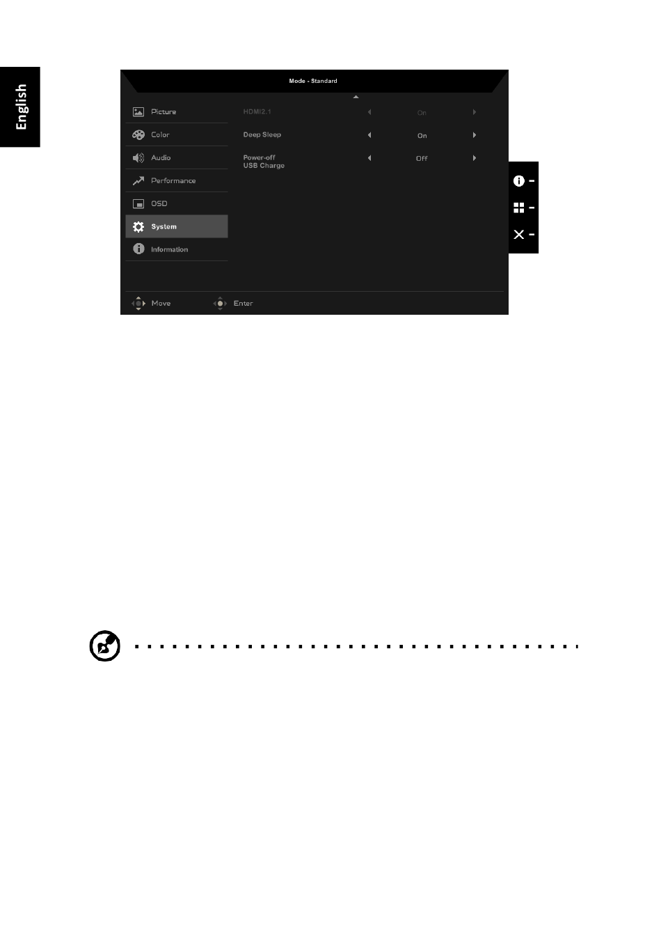 • Quick Start Mode: Speeds up the monitor's boot-up process (Off /