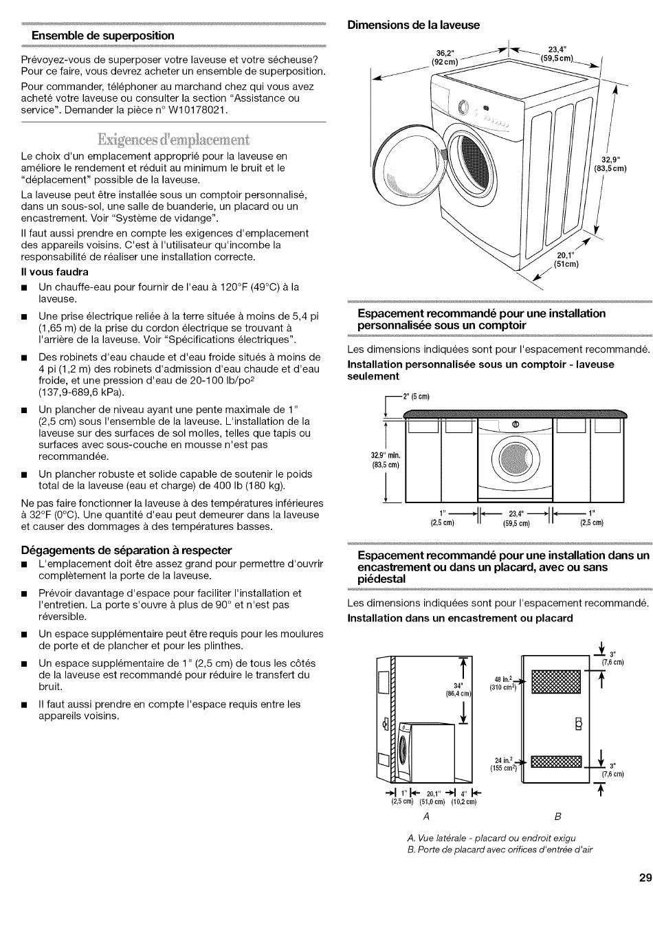 (2,5 cm) sous I'ensemble de la laveuse. L'installation