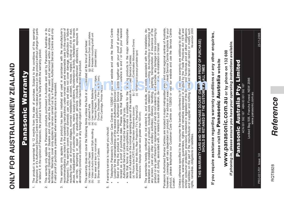 RR-QR230 Panasonic Warranty (Only For Australia/New Zealand)
