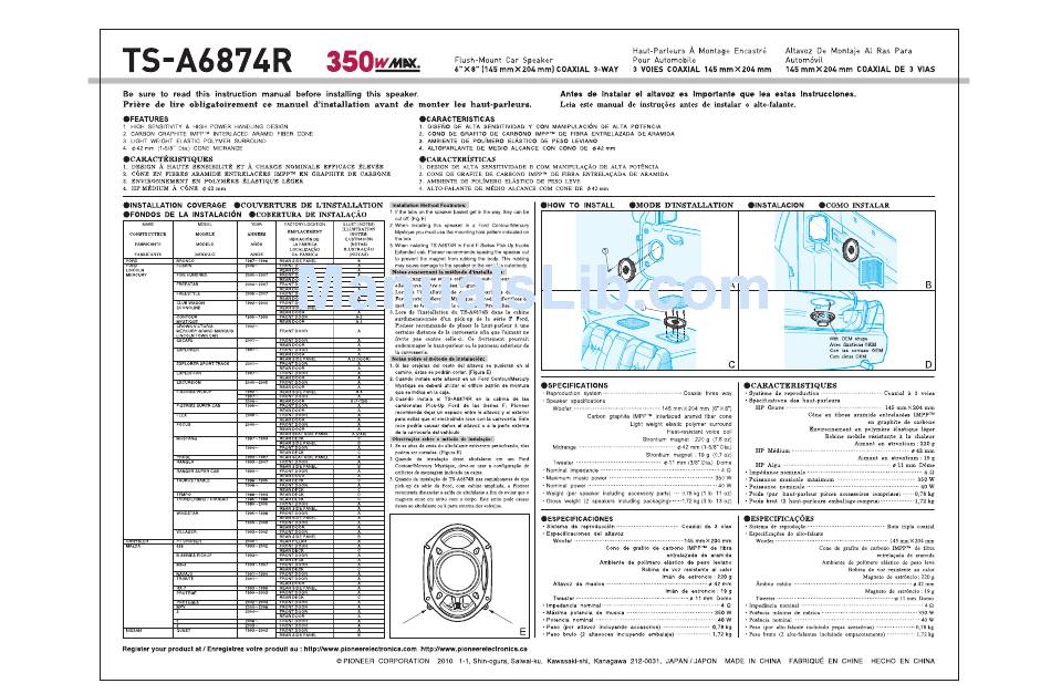 Features; Installation Coverage; How To Install; Specifications - Pioneer Ts-A6874R Instruction Manual