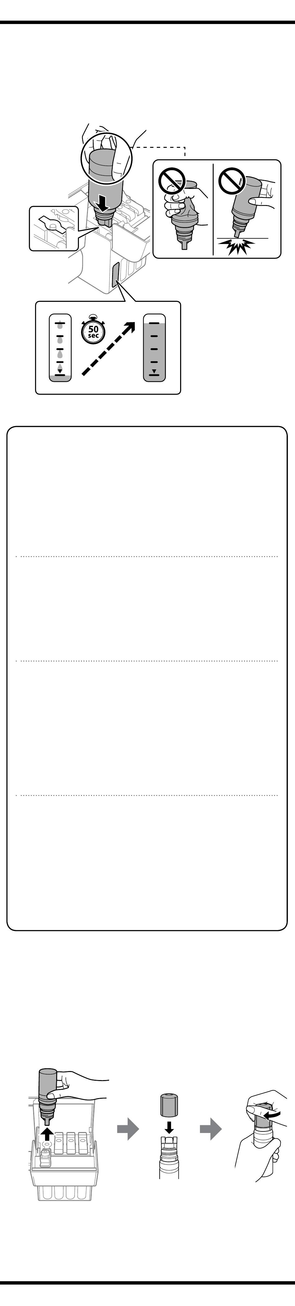 O Nếu mực không bắt đầu chảy vào hộp mực, tháo chai mực và lắp