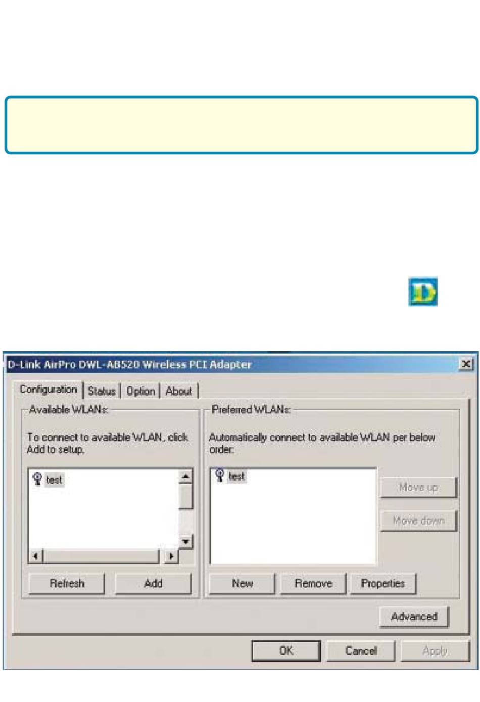 Note: With its default settings, the DWL-AB520 will associate with D-Link Air/