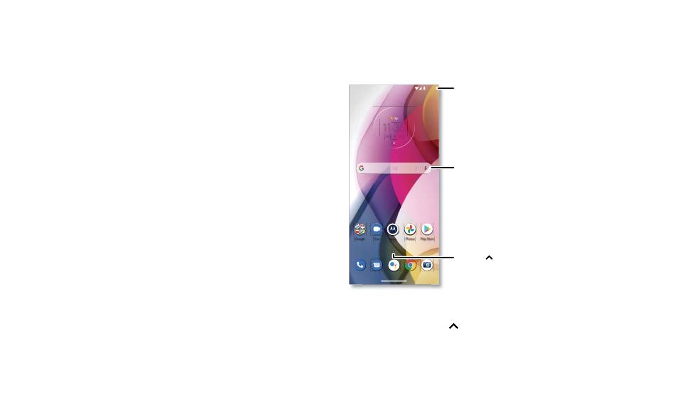 Home screen. At the top, tap the Google bar to type search options or tap the right hand microphone icon to speak a search. Icons at the top show notifications and phone status icons. Swipe up from center bottom to