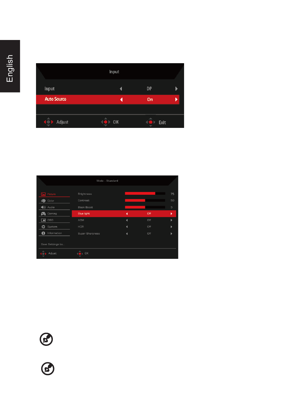The Picture menu can be used to adjust the Brightness, Contrast, Black Boost, Blue