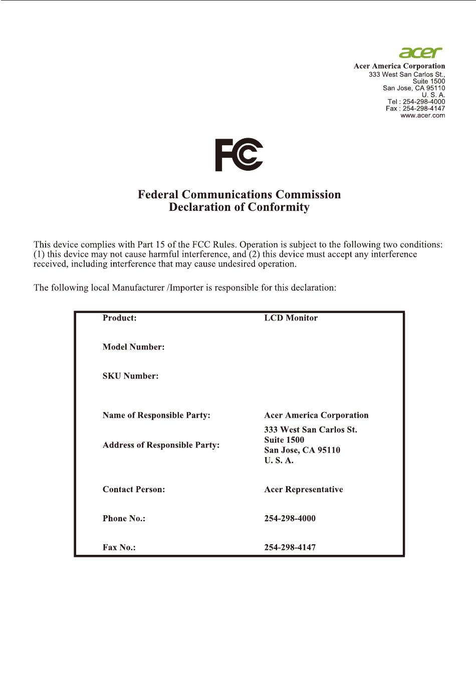 Federal Communications Commission Declaration Of Conformity - Acer Nitro Ed270U P2Bmiipx User Manual