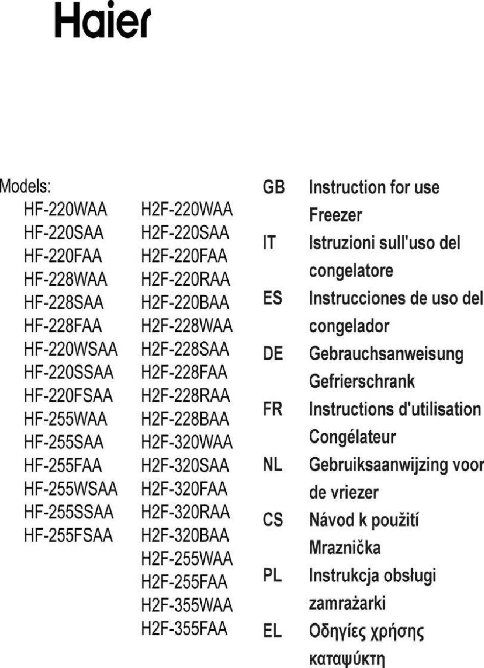 Haiet Models: Instruction for use HF-220WAA H2F-220WAA F reezer HF-220SAA H2F-220SAA Istruzioni sull'uso HF-220FAA H2F-220FAA congelatore HF-228WAA H2F-220RAA Instrucciones de uso del HF-228SAA H2F-220BAA congelador HF-228FAA H2F-228WAA HF-220WSAA H2F-228SAA Gebrauchsanweisung HF-220SSAA H2F-228FAA Gefrierschrank HF-220FSAA H2F-228RAA Instructions d'utilisation HF-255WAA H2F-228BAA Congélateur...
