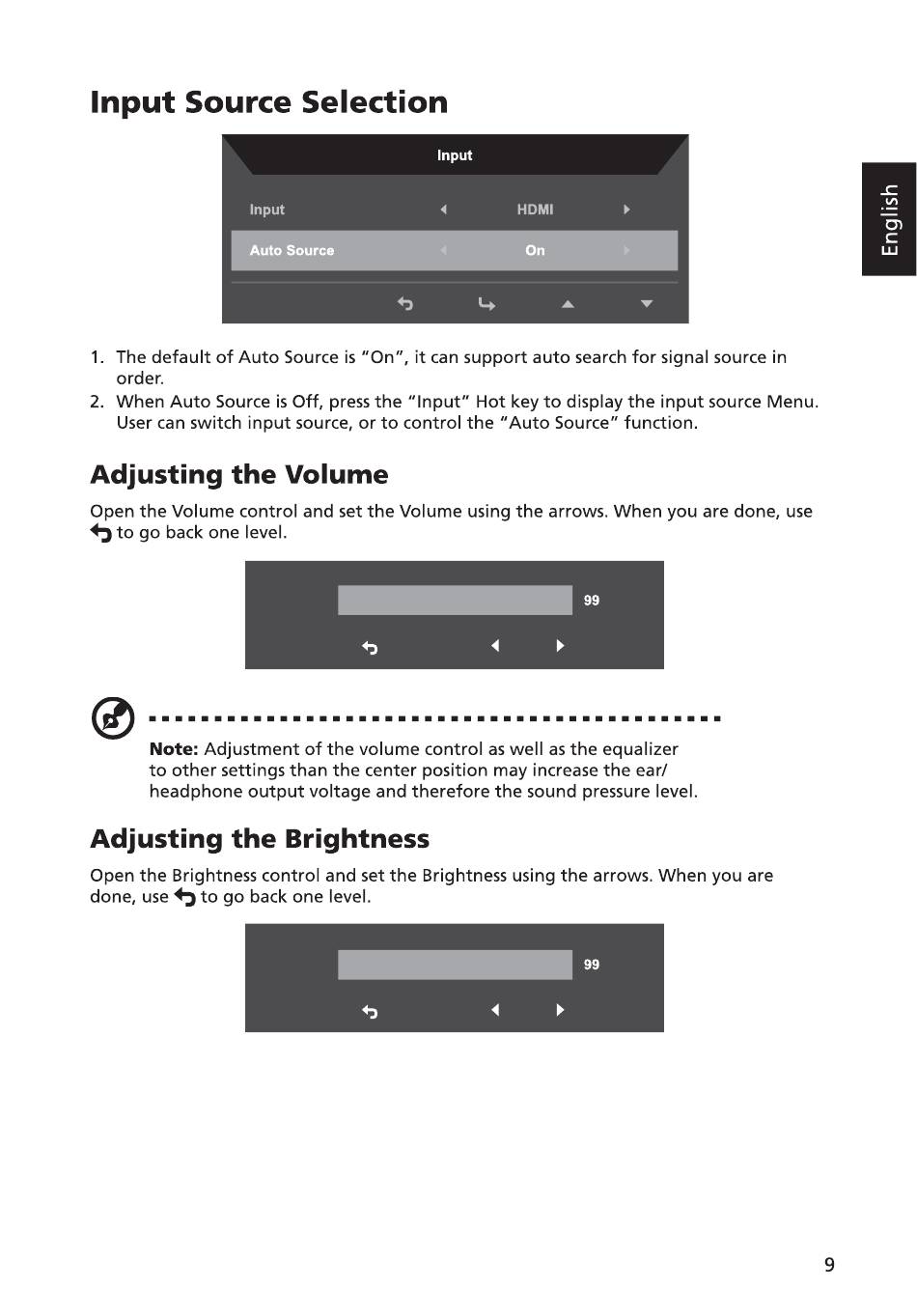 Input Source Selection Adjusting The Volume 9; Adjusting The B Rightness - Acer Sa220Qbbix User Manual