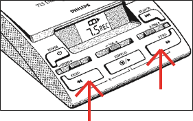 You can cue the tape by depressing the middle pedal of the foot control. The tape winds for as long as you keep this pedal depressed. As the tape winds you can hear it played back at speed, helping you to locate a specific piece of dictation.