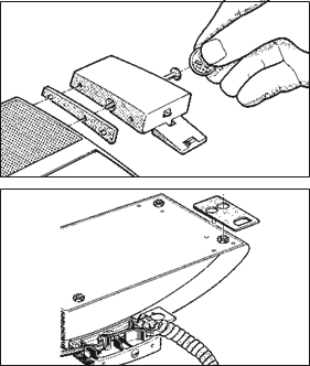 The hand-held microphone (18) can be installed on the left or right side of the 725 to suit your personal convenience. Simply align the holder with the mounting plate and attach it into the 725 using the long screw provided.