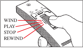 Slide the four-position switch down and hold it to rewind your recording until you reach the point at which you wish to commence playback, then slide the switch to play to to listen to your recording. Depending on the position of the loudspeaker switch (16) you can listen via the built-in loudspeaker, the microphone loudspeaker, or headphones.