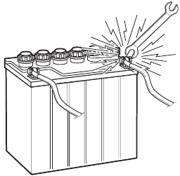 Sparking can occur when working with the battery and the heavy cables of the starter circuit. This can cause battery explosion, fire or eye injury. Sparking in this circuit can not occur after the chassis cable (normally negative, black) is removed from the battery.