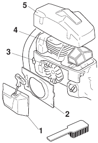 | Clean the outside of the machine. | On chain saws without a catalytic converter, check the cooling system weekly. | Check the brake band on the chain brake for wear. Replace when less than 0.024 inch (0.6 mm) remains at the most worn point. |