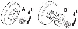 | The bar should be turned daily for more even wear. Check the lubrication hole in the bar, to be sure it is not clogged. Clean the bar groove. If the bar has a sprocket tip, this should be lubricated. | Lubricate the clutch drum bearing. | Clean the outside of the carburetor. |