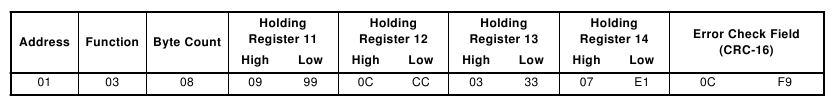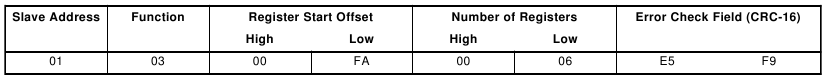 | Address | Function | Register Start Offset High | Register Start Offset Low | Number of Registers | Error Check Field (CRC-16) | |