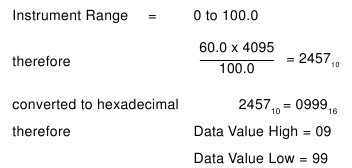 Since all register values for measured variables and alarm set points (scaled parameters) are ranged to 12 bits (for RTU), then to calculate the Data Value High and Data Value Low for a setpoint of 60.0 the following method is used: