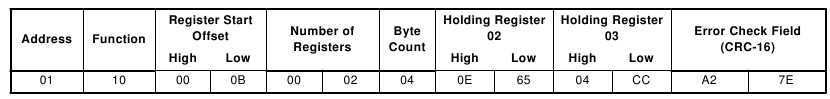 | Address | Function | Register Offset High | Register Offset Low | Data Value High | Data Value Low | Error Check Field (CRC-16) |