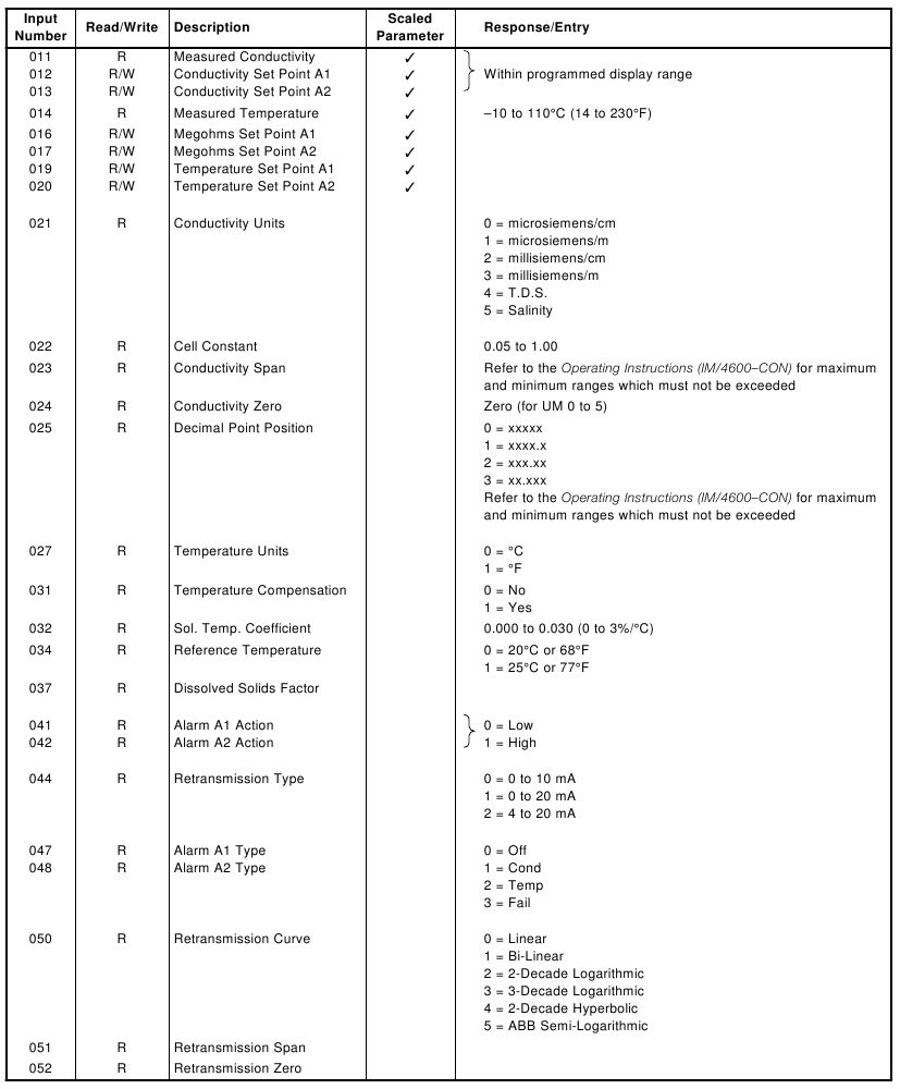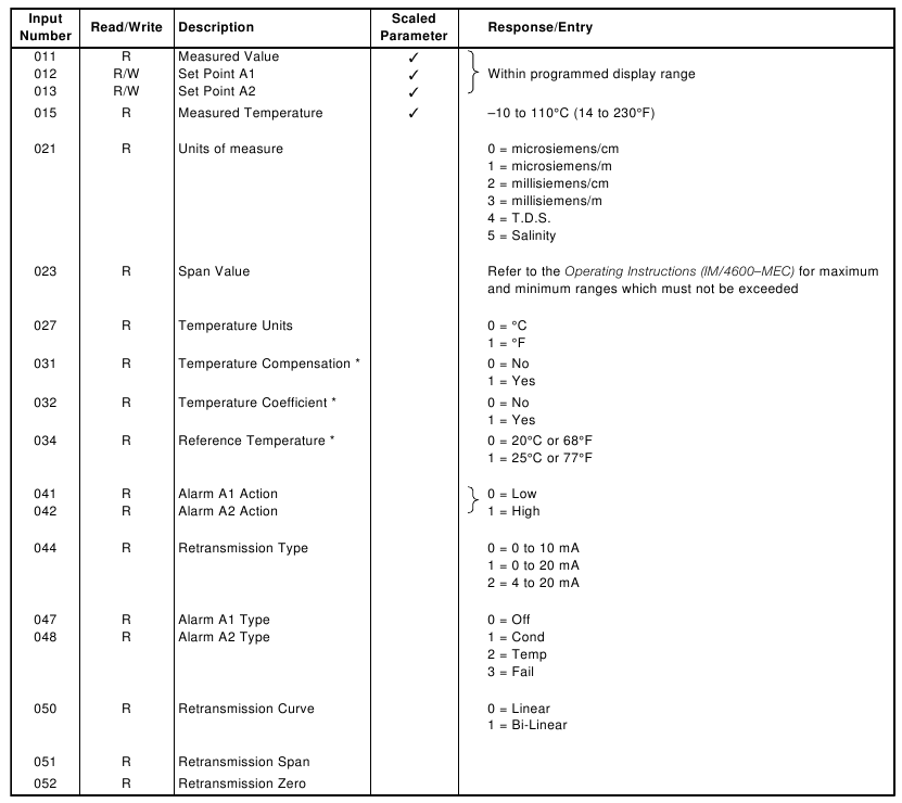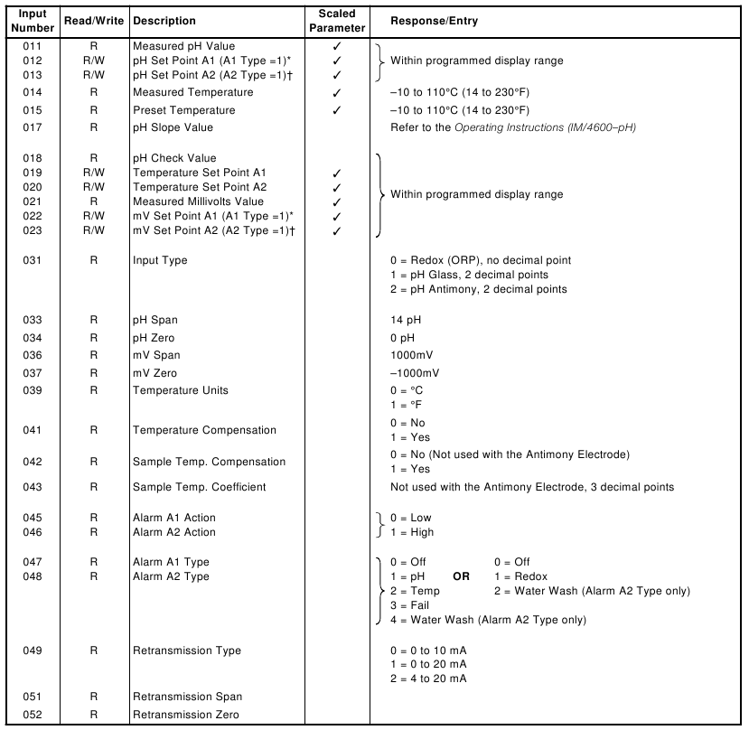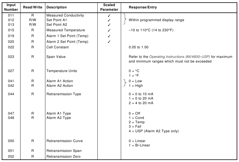 | 03 | Read Holding Register | Up to 8 consecutive registers from a specific starting register. The 4600 returns zeros from registers which do not contain defined data and NAKs any request for register numbers greater than 100. |