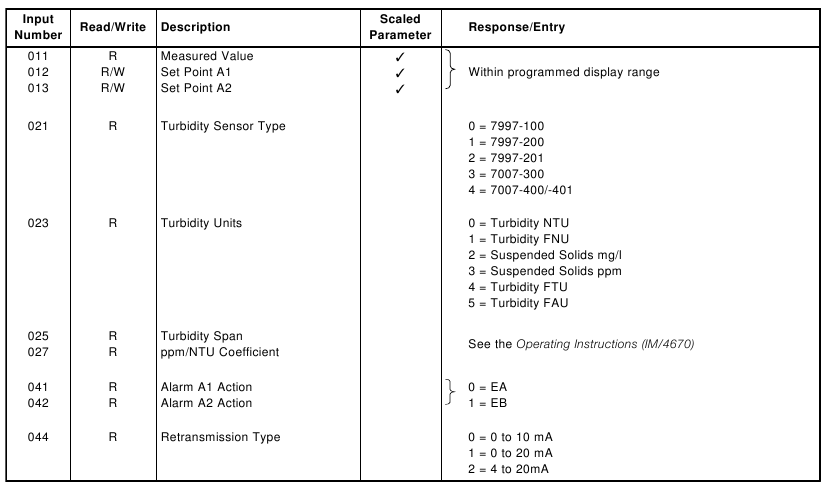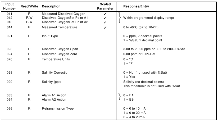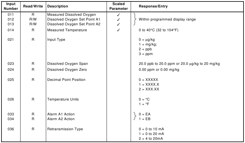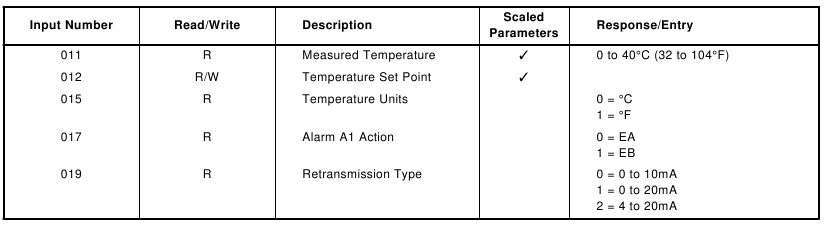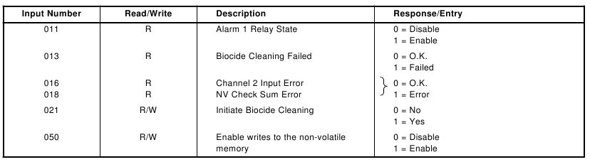 | Input Number | Read/Write | Description | Response/Entry |