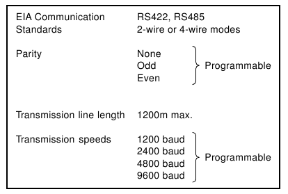 A standard method of electrical connection is used between the master and the slaves, with defined voltage levels and characteristics. The transmitter and receiver integrated circuits within the 4600 meet the requirements of the EIA (Electronic Industries Association, American) RS485 and RS422 Serial Interface Standards.