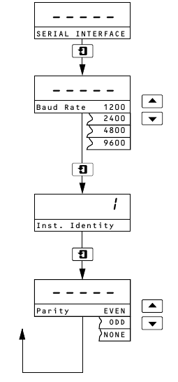 The general programming procedure is as detailed in the Operating Instructions but with an additional Serial Interface page between the Set Up Outputs and Electrical Cal pages.