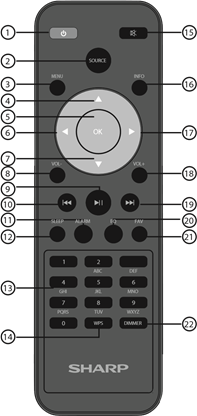 - SOURCE – Press the SOURCE button to change the playback modes: DAB/DAB+, FM, AUX IN, Bluetooth, Internet Radio.
