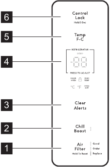 ![]() | Refrigerator compartment button | Select Refrigerator compartment to change the temperature. Select +/- buttons to set the temperature. Refrigerator control range: +33°F (+1°C) to +43°F (+6°C). |
