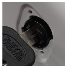 From the initial position at 12 o'clock (where the battery is locked), insert the key in the appropriate slot, press and turn it clockwise to the 6 o'clock position to unlock it. Reverse the same procedure to relock the battery.