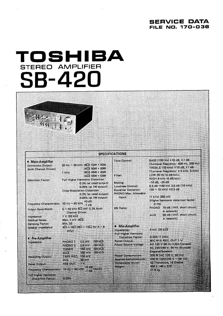 SERVICE DATA 170-033 FILE TOSHIBA STEREO AMPLIFIER SB-420 SPECIFICATIONS SASS 'fioOHi/QiO d B, 4WHz. Continuous O utputt TREBLE (Both Channel p rivenj -140) sswvssw Filter: HIGH 8 Disprtiorifåeters: Higher HaemohiC Distortion 0.3% (at Output) MUting, dB 000 Hi) kHzÜ COOdnesControV;...
