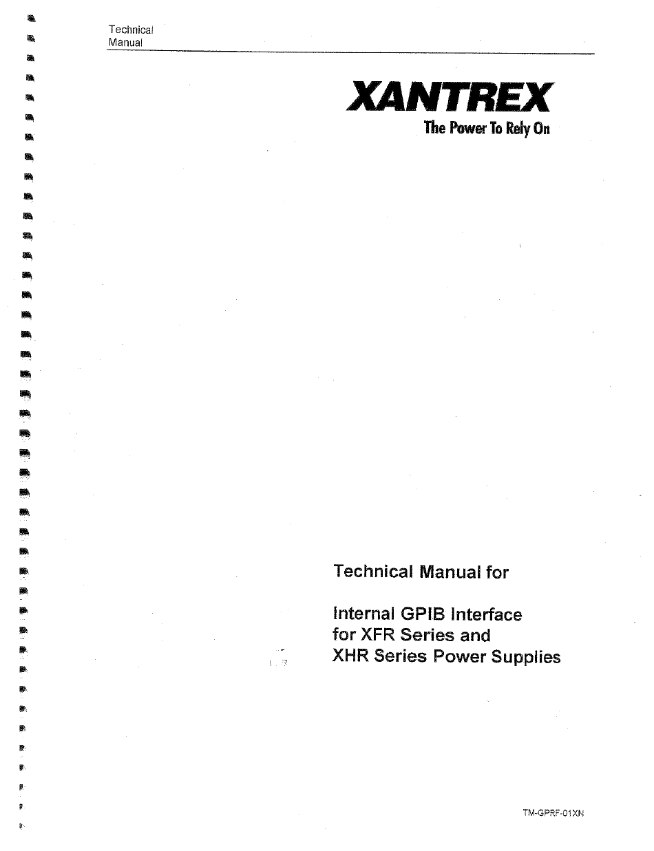 GP!B INTERFACE ABOUT THIS MANUAL ABOUT THIS MANUAL Thistechnical manual i s for theInternal G PIBinterface, a microprocessor-controlled optioncardfor XFR Series a ndXHR Series DC outputpowersupplies. This manual p rovides y ouwith descriptions and specification user o ptions, andconfiguration instructions, in addition t oacommand set w hich enables you to manage thepower supply f romanexternal source.