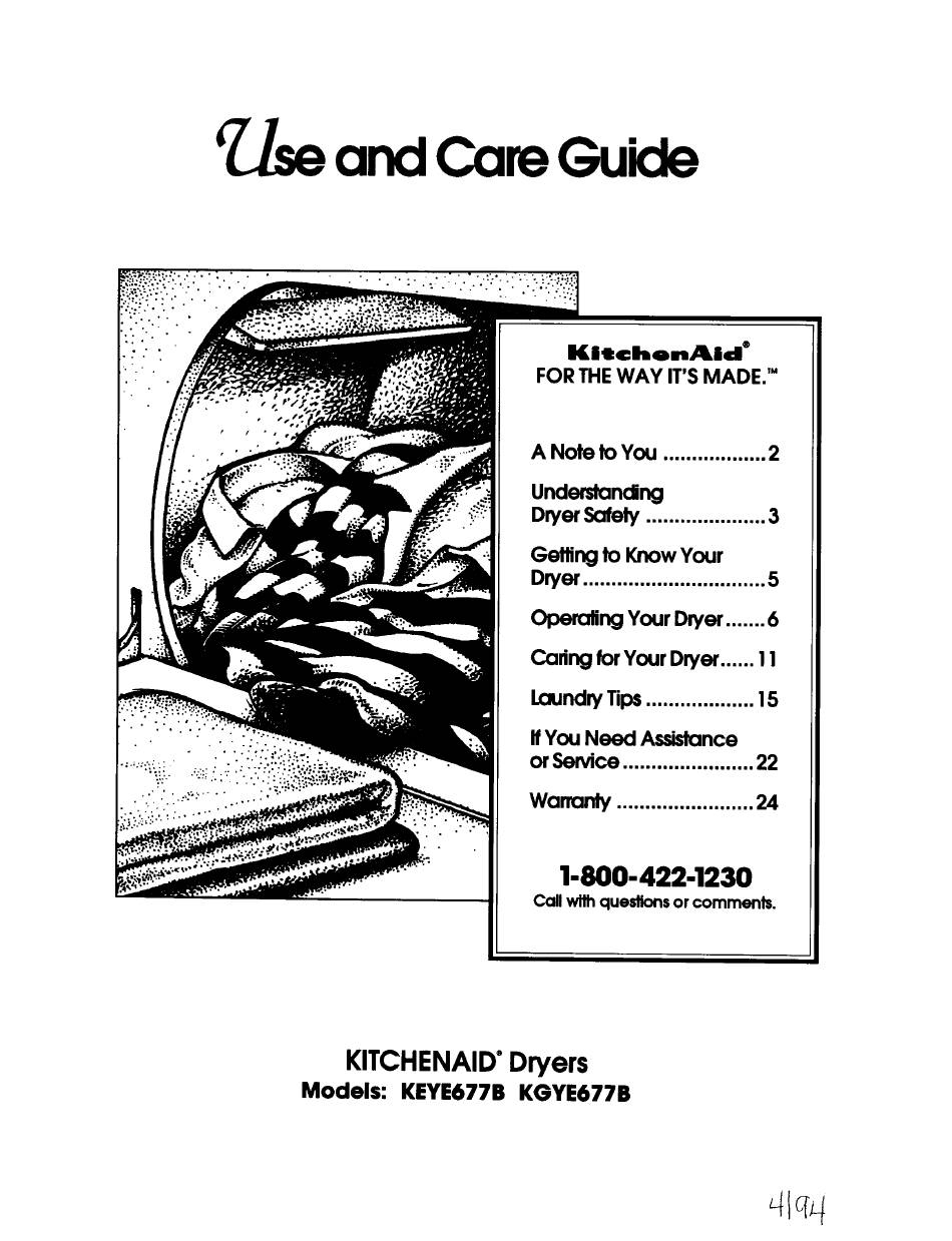FOR THE WAY IT'S MADE.'" A Note Under<andng Dryer "ety Gettitv to Know Your Dyer..5 Operaitv Your Dyer ..6 brYour Dryer..11 IAIndry Tips tf You Need Assistance or Service Warrar$,' 1-800-422-1230 wtth queåions or comments. KITCHENAID' Dryers Models: KEYE677B KGYE677B Lllqq...