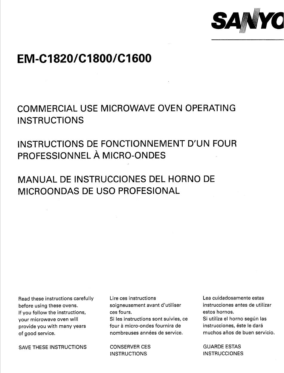 SANYO EM-C1820/C1800/C1600 COMMERCIAL USE MICROWAVE OVEN OPERATING INSTRUCTIONS INSTRUCTIONS DE FONCTIONNEMENT D'UN FOUR PROFESSIONNEL Ä MICRO-ONDES MANUAL DE INSTRUCCIONES DEL HORNO MICROONDAS DE USO PROFESIONAL Lire ces instructions Lea cuidadosamente estas Read these instructions carefully soigneusement avant d'utiliser instrucciones antes de utilizar before using these ovens.