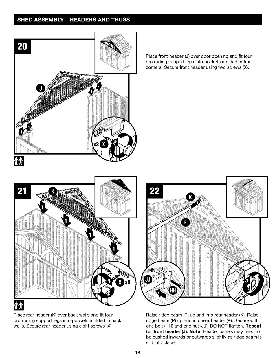 corners. Secure front header using two screws (X).
