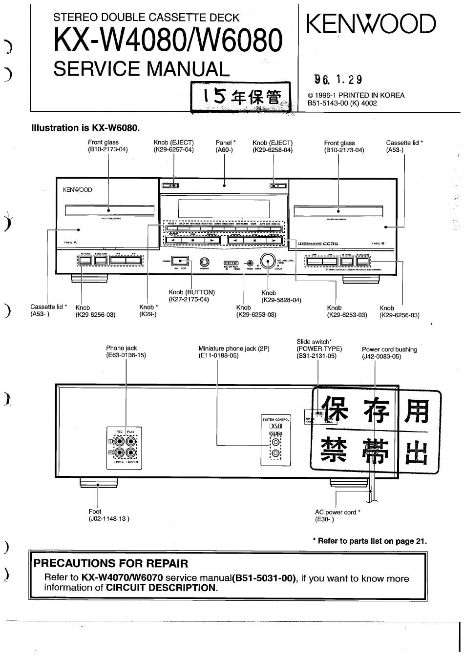 STEREO DOUBLE CASSETTE DECK KENWOOD KX-W4080/W6080 SERVICE MANUAL '96. 1.29 0 1996-1 PRINTED IN KOREA B51-5143-00 (K) 4002 Illustration is KX-W6080. Front glass Knob (EJECT) Panel Knob (EJECT) Cassette lid * Front glass (BIO-2173-04) (K29-6257-04) (A60-) (K29-6258-04) (BIO-2173-04) (A53-) KENWOOD...