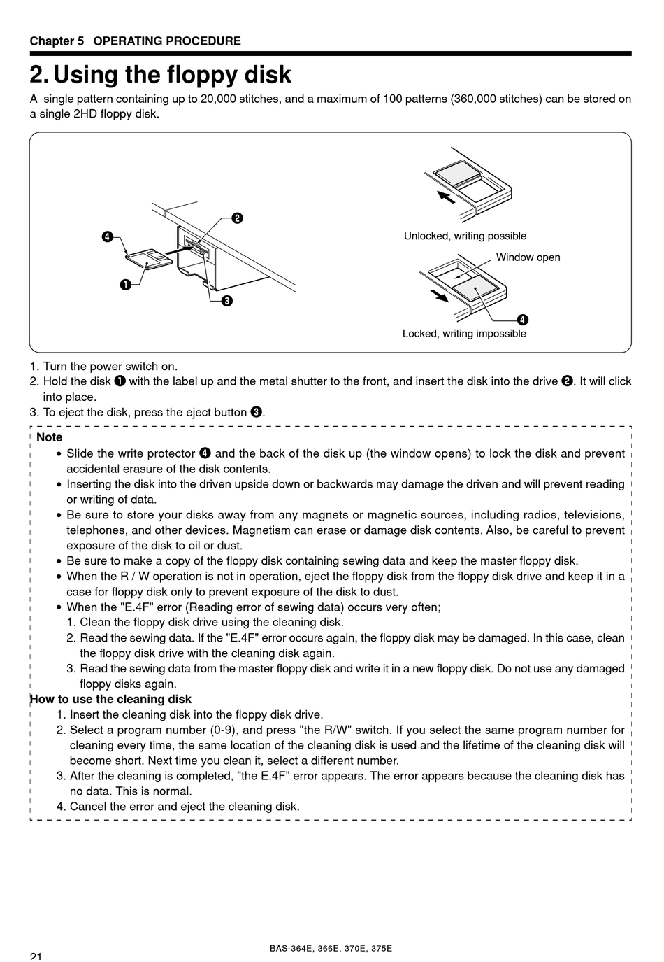 2. Read the sewing data. If the "E.4F" error occurs again, the floppy disk may be damaged. In this case, clean