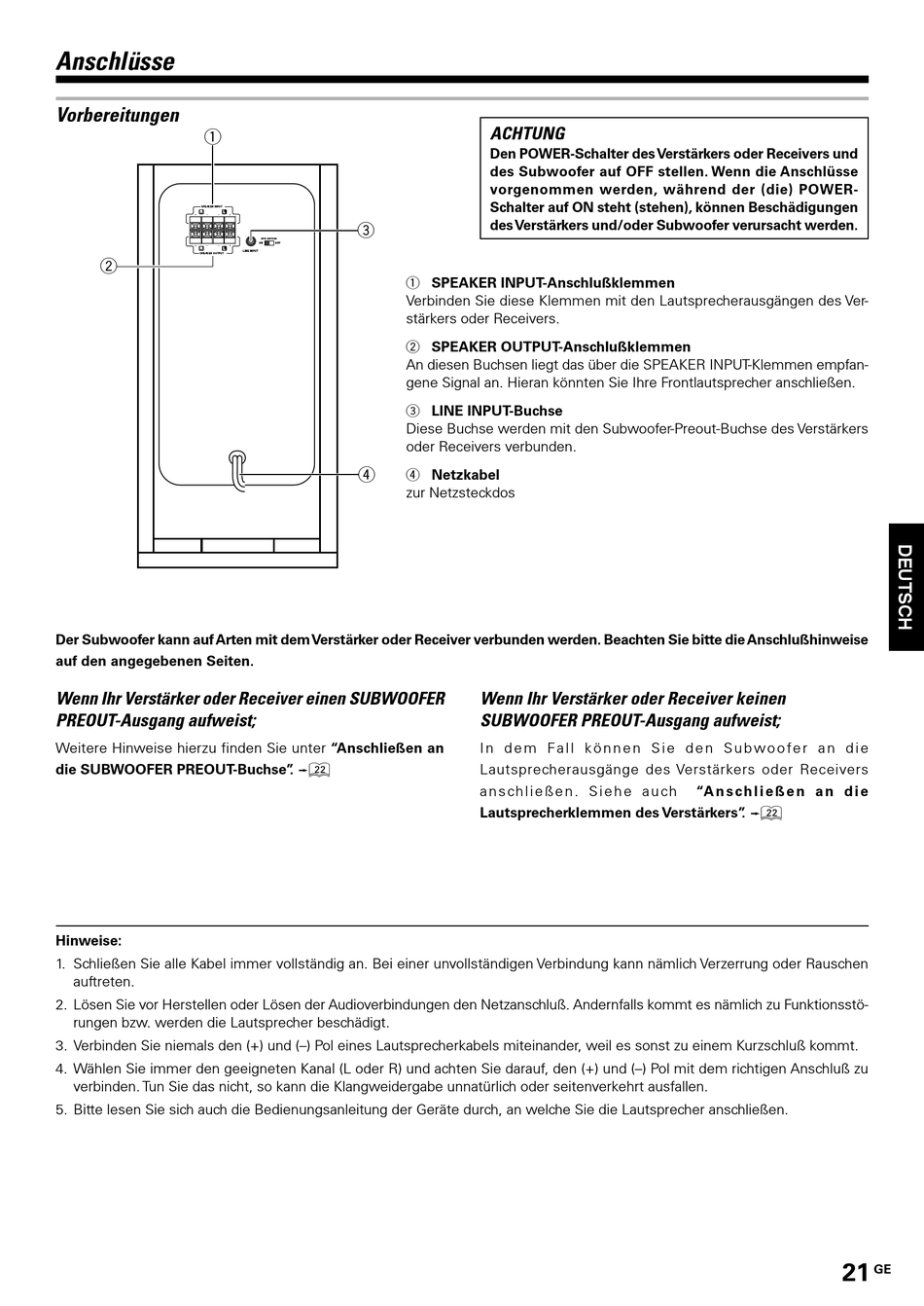des Subwoofer auf OFF stellen. Wenn die Anschlüsse