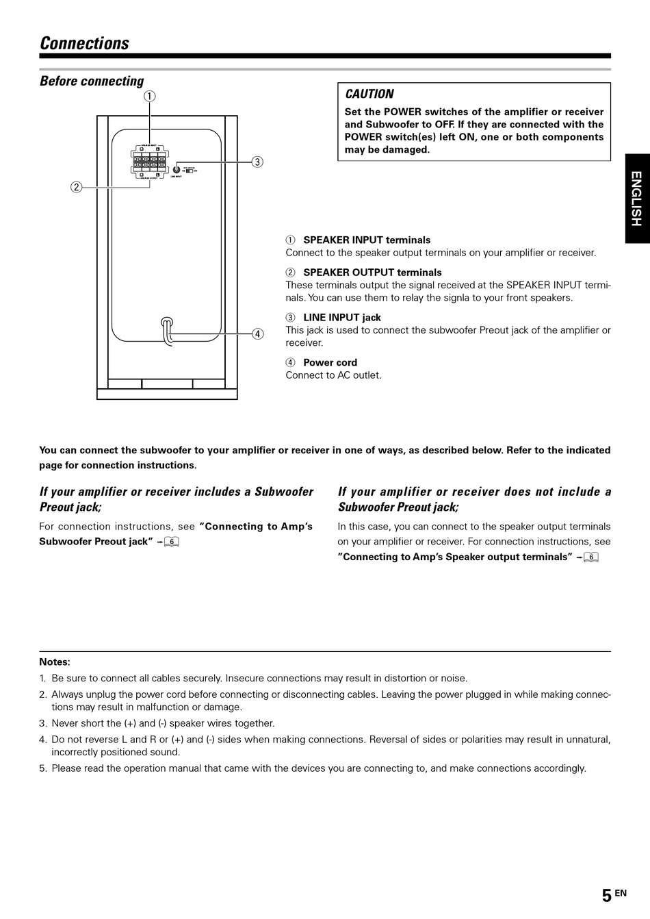 1. Be sure to connect all cables securely. Insecure connections may result in distortion or noise.