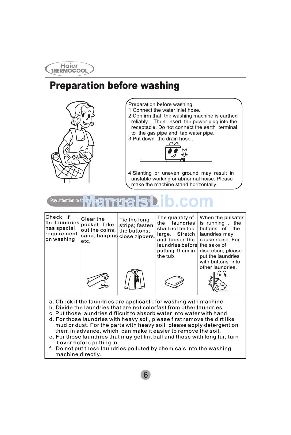 Preparation Before Washing - Haier Thermocool Hwm110-287S User Manual