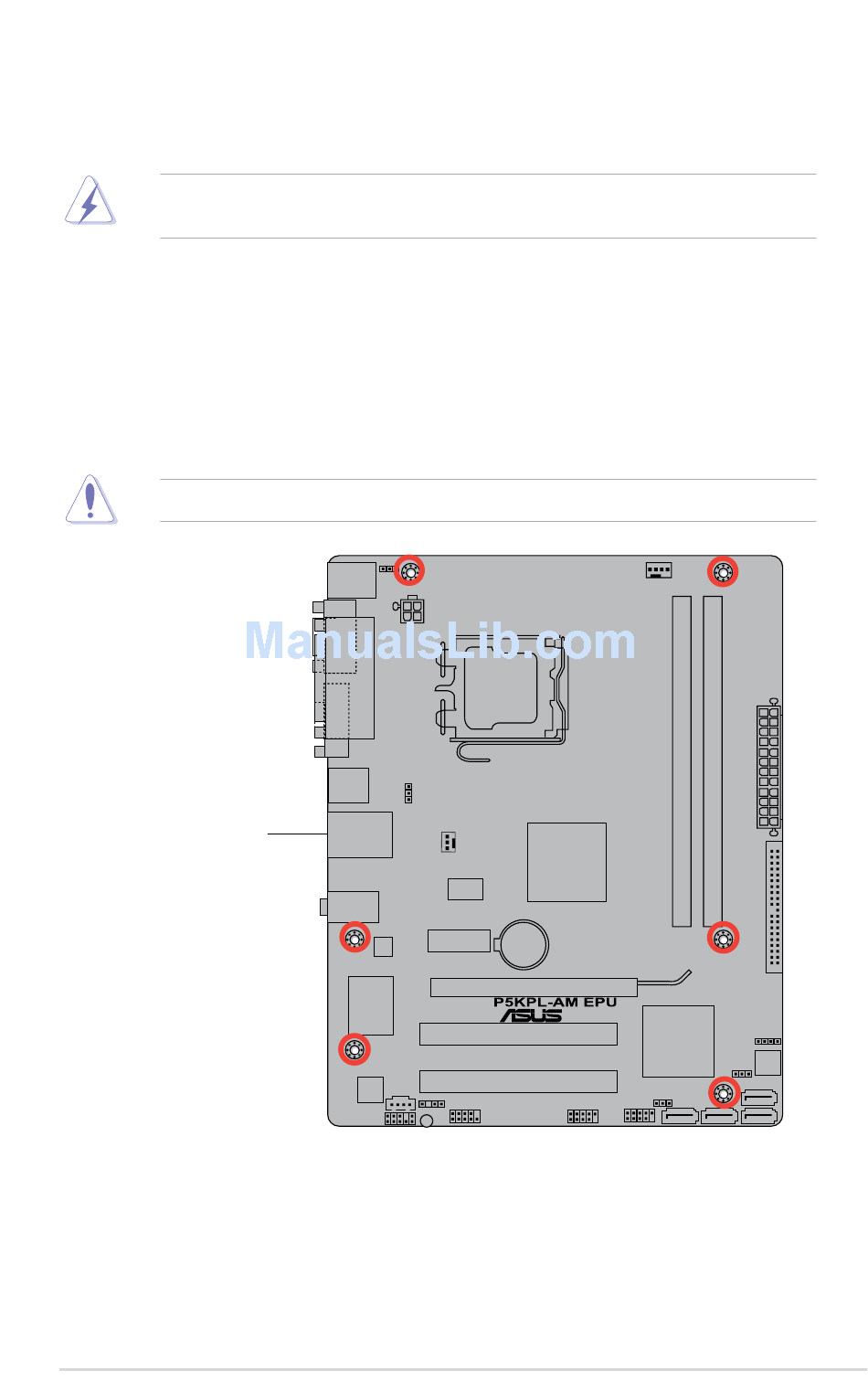 Do not overtighten the screws! Doing so can damage the motherboard.