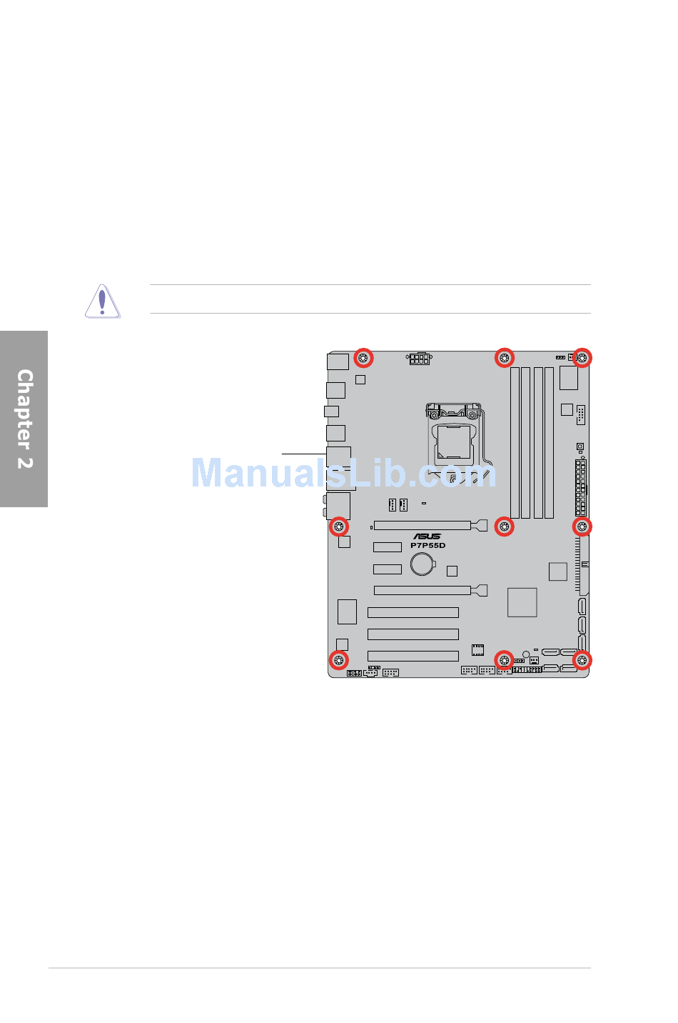 Place nine screws into the holes indicated by circles to secure the motherboard to the