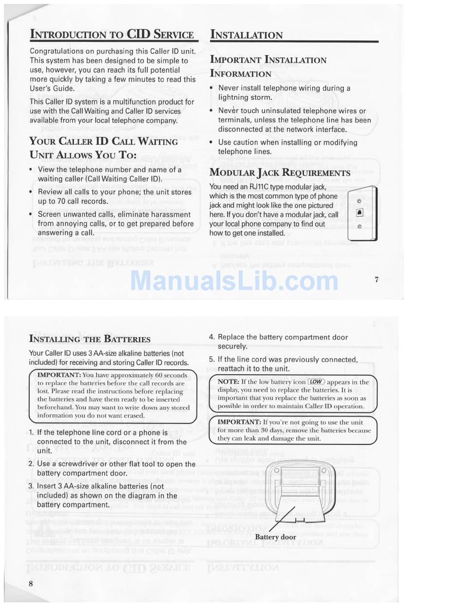 Installation; Modular Jack Requirements; Introduction To Cid Service; Important Installation Information - Ge 29096Ge1-B Manual