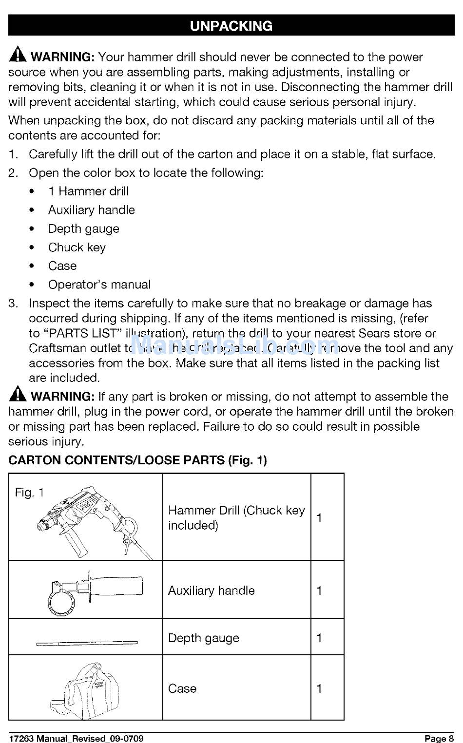 lift the drill out of the carton and place it on a stable, flat surface.