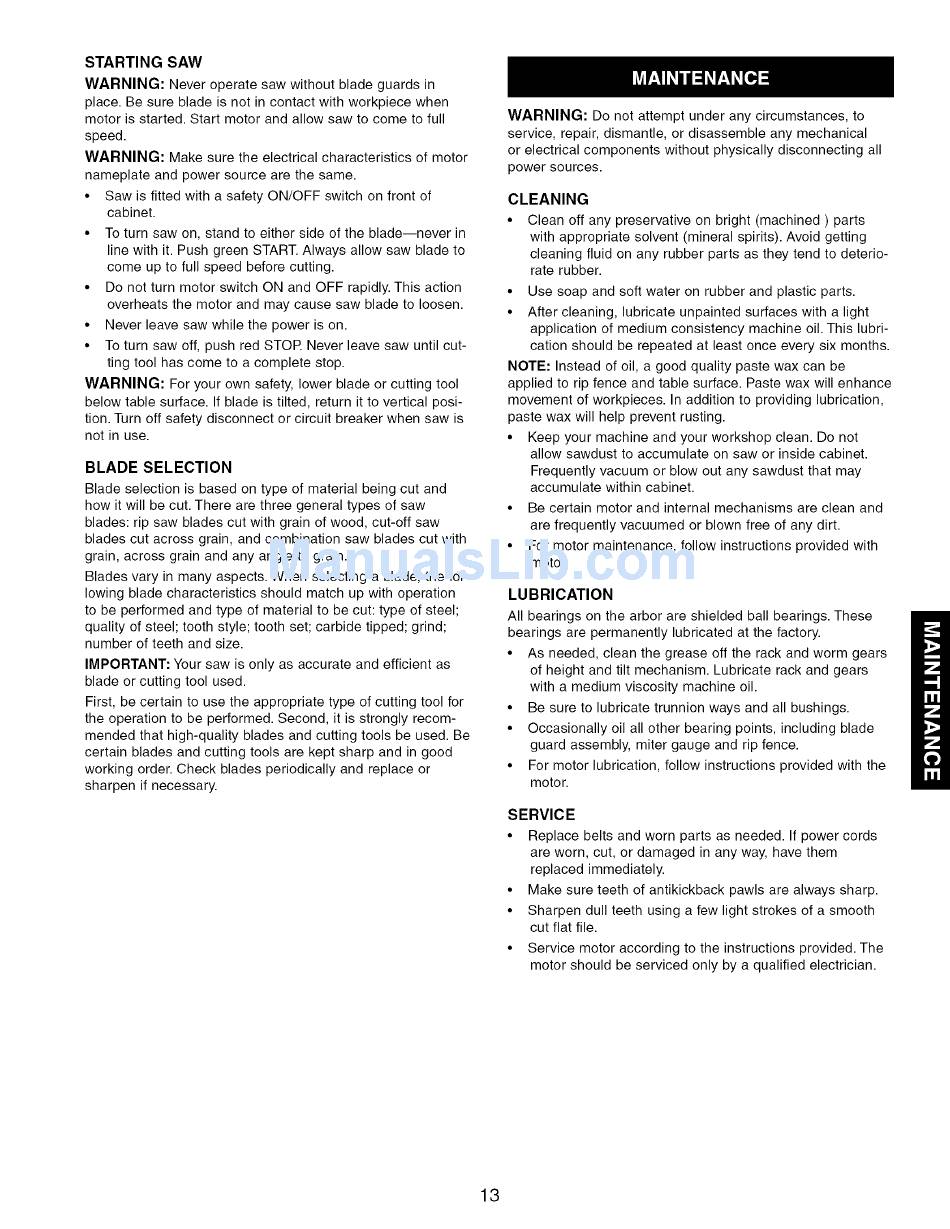 line with it. Push green START. Always allow saw blade to