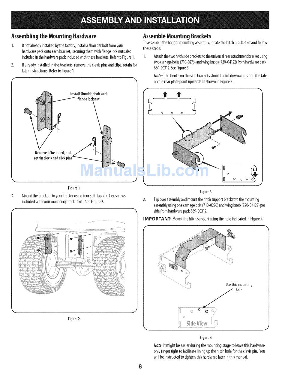 Toassemble the bagger m ountingassembly, locatethe hitchbracketkit andfollow